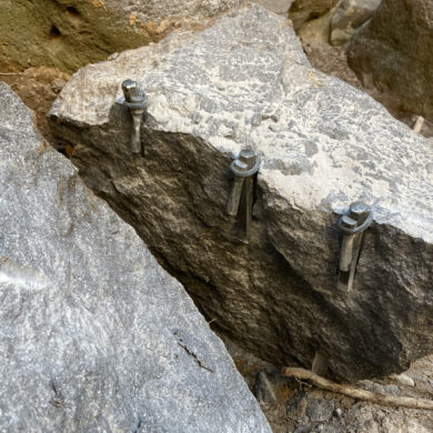 用水路の工事のときに立ててくれた擁壁には柱穴が無いので、擁壁裏に穴を掘って下に砂利をしいて叩き、高さを揃えて穴の空いた400mmの束石を置き、土を叩いて埋めて据えたら穴に柱を立てていく。柱は抜けるように、アルミの角柱のみを頭60mm程度を出した状態で200mm程度コンクリートで埋め込み、アルミ柱の厚み分の2mm木の周囲を切り欠いたものを差し込むようにした。擁壁が曲がり、高さ方向にも斜めに桟木を打ち付けないといけない部分はなかなか悩ましい大工仕事となったが擁壁面からフェンス面のセットバック寸法を揃えて、現場合わせでなんとか納めることができた。コンクリートを埋めるときは周りが汚れるのでマスキングも忘れずに。施工中は柱が振れないよう、単管を組んでクランプで一日固定しておいた。アルミの土台以外は全てイペというハードウッドを使った。すべて頂き物なのだが、やはり木はあたたかみがあり周囲の自然環境に調和して良い。