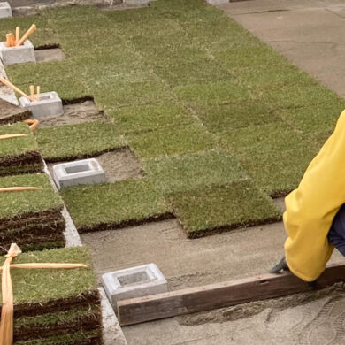 庭を造るのと平行してフェンスを立てた。フェンスを立てることで転落や侵入の防止はもちろん、作り方によっては周辺との良好なコミュニケーションを築くために視線を通したり遮ったりすることもできる。まずは図面を書いてどんなフェンスにするか決めていく。フェンスが決まったら擁壁を工事してくれる業者に図面を渡し、柱を立てる位置に角型のボイド管を入れてコンクリートを打ってもらい、柱穴の空いた擁壁をつくってもらった。隣地との境界は隣地所有者との関係性を考え、自分で工事しないことも時には有用だ。