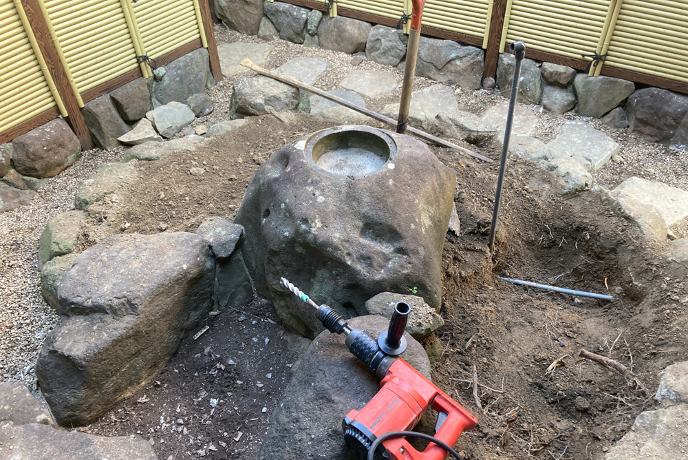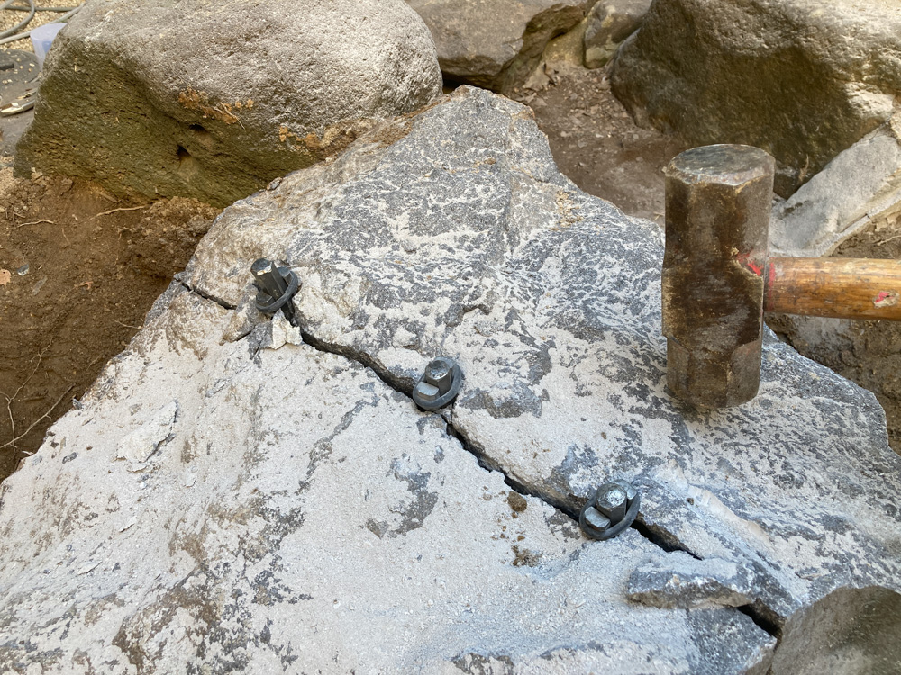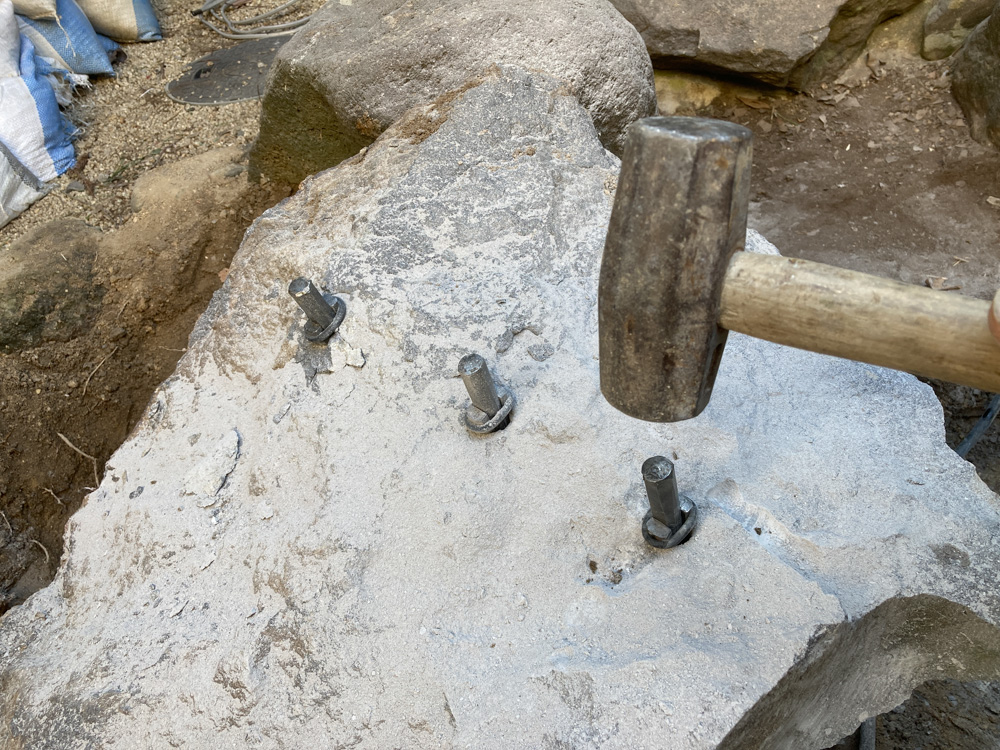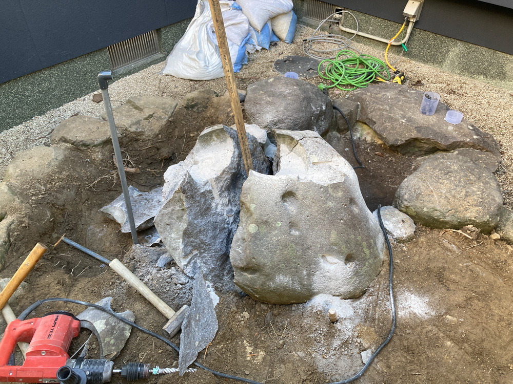 搬出したいのは300kgくらいの大きな石で、Tip72: 吊るでやったようにチェーンブロックを使って動かせるが、狭くてチェーンブロックを吊っている足を立てながら搬出するトラックまで移動することができない。クレーン車を借りてくることもできるが、数万円の費用がかかるし慣れていないと危険な作業だ。そこで、石を手で運べるサイズに割って安全に搬出することにした。