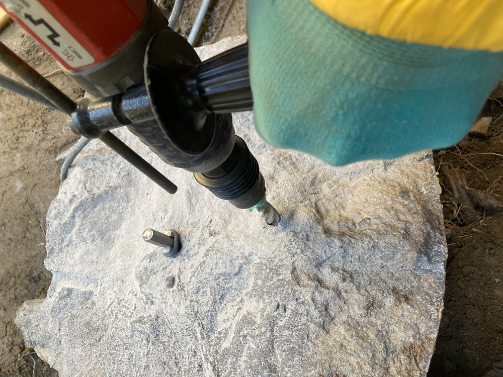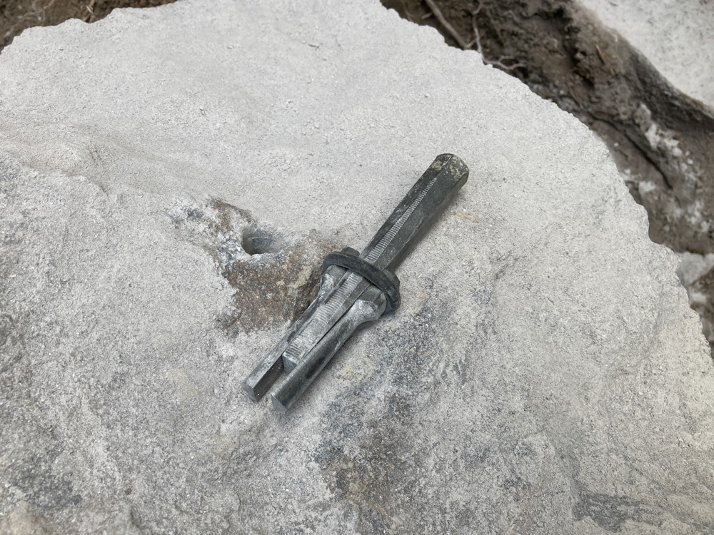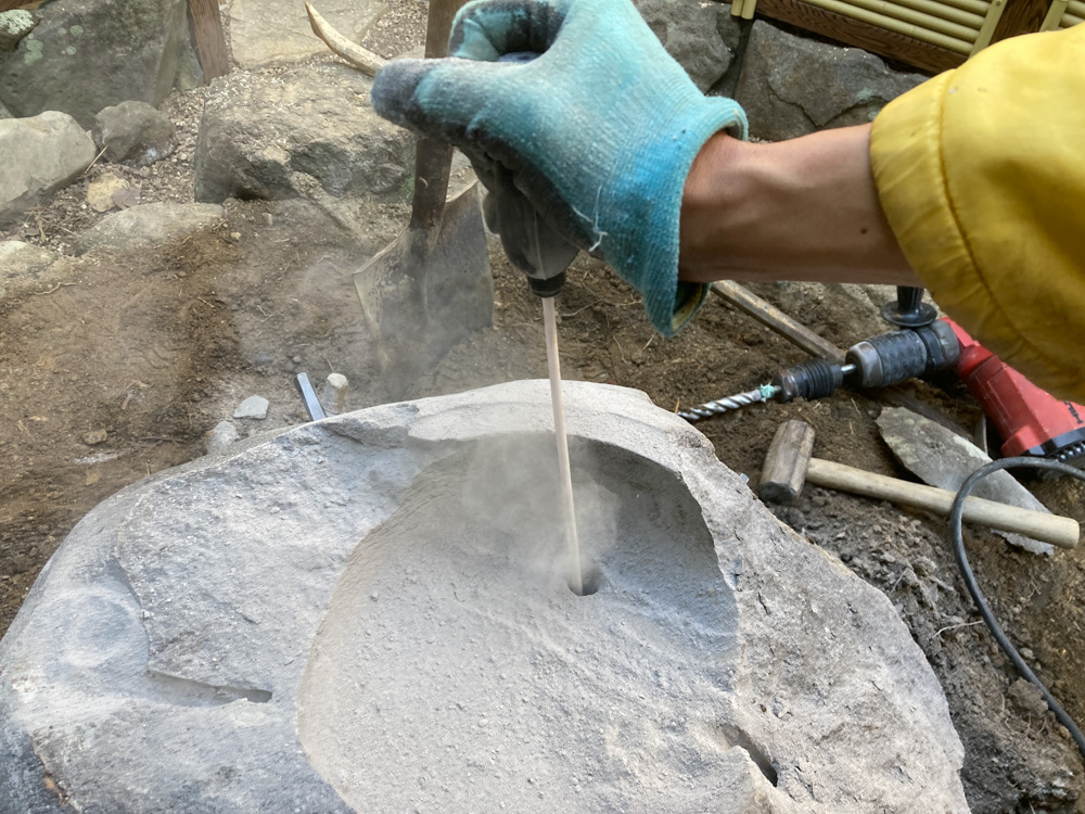 ドリルで開けた穴の中のゴミを取り、セリ矢を石を割る目と直角方向に力がかかるようにセットし、ハンマーで打ち込んでいく。割れなければセリ矢を追加していく。