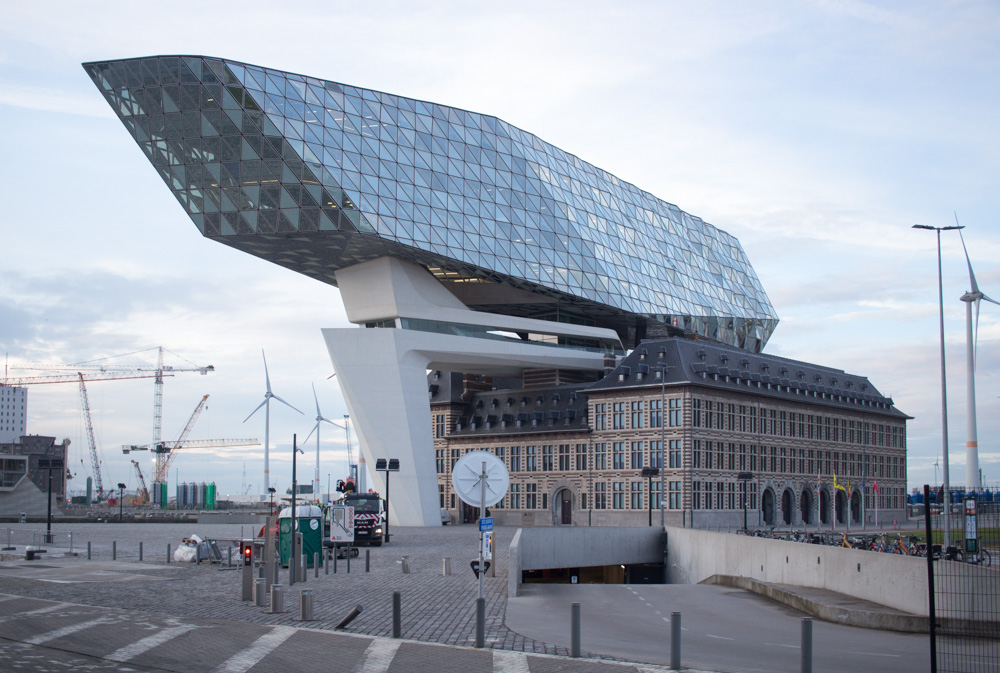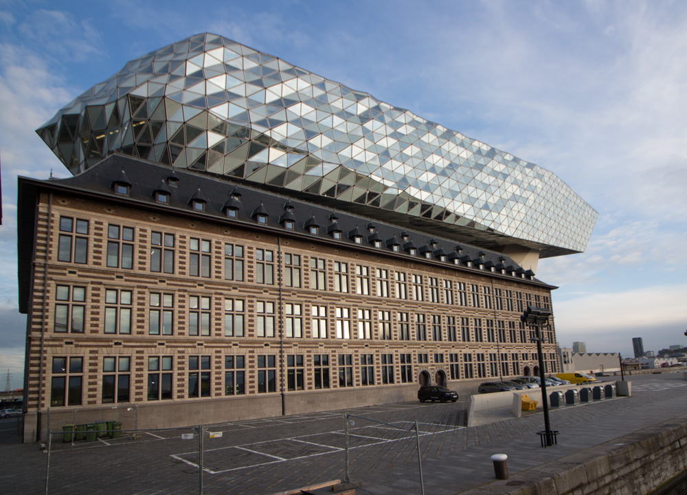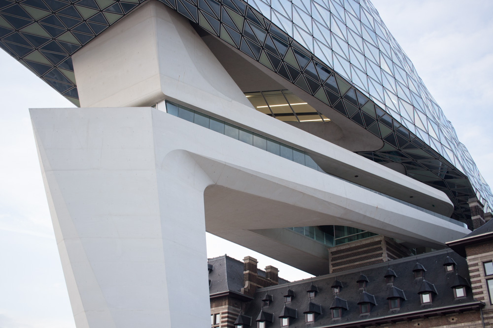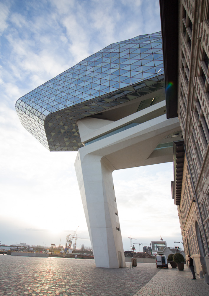 旧港湾局の建物の上に、ガラスの塊が乗っかっている。アントワープはダイヤモンドで有名な街であり、その文脈を踏まえて、ガラスはクリスタルのような素材として使われているのだろう。そのガラスのボリュームを、ザハ建築特有のコンクリートの塊が下から支えている。ガラスは周囲の空や街を映し込み、時間帯によって表情を変えていく。