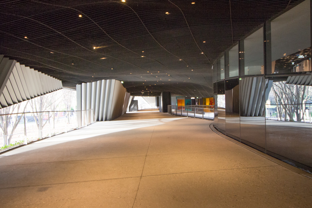 外装の鋼の板が籠のように編み込まれて、様々な鋼板の曲率により表情に多様性をもたらしている。鋼板に穿たれた小さな穴が大きくなったりなくなったり、光を通したり遮ったり。天井の幾何学的なパターンが壁にまで連続したり、途切れたり。まるで生きているかのような建物で、多様な空間体験を生み出していた。