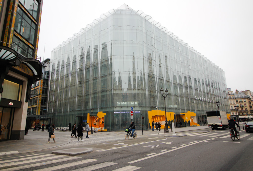 パリの老舗デパート La Samaritaine もその代表的な例だ。アール・ヌーヴォー館は細部まで丁寧に修復され、色彩や装飾は当時の華やかさを取り戻している。一方で、SANAA による新しいガラスのファサードは周囲の街並みや空を映し込み、環境に溶け込むように計画されている。内部には中庭のような開放的な空間がつくられていて、都市の中にいながら外にいるような気持ちよさがあった。幾度も改修を重ねながら、この建築は姿を変えてきた。歴史を残すために、さらに歴史を積み重ねているところなのだろう。