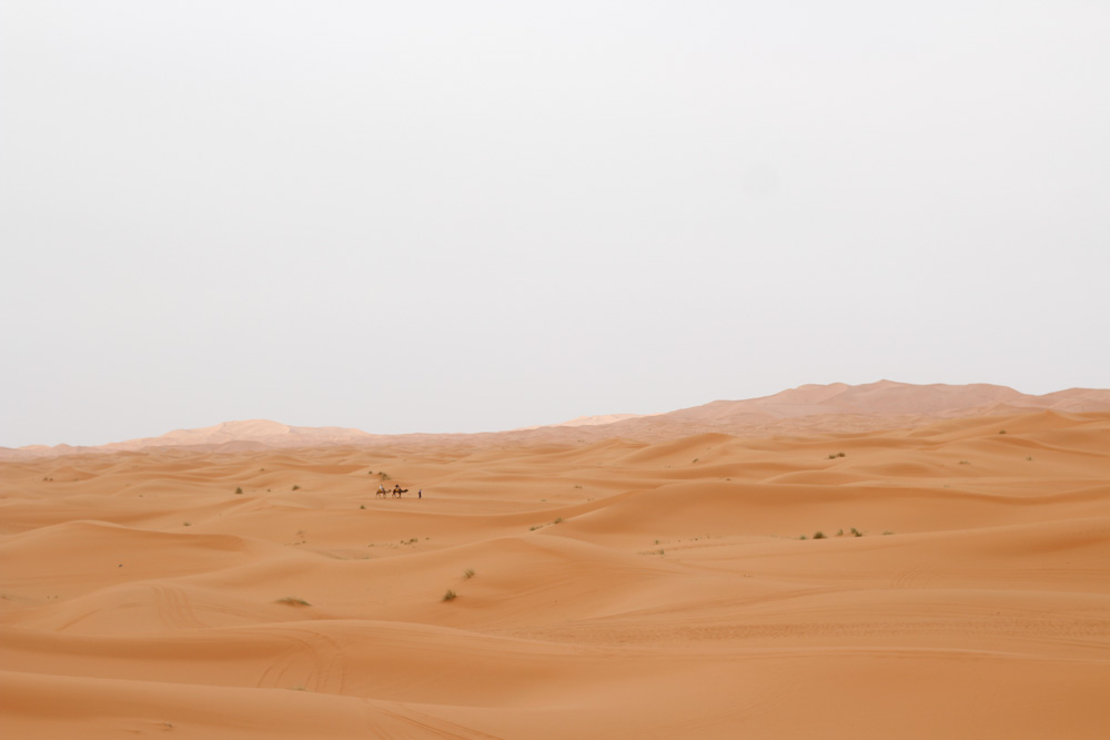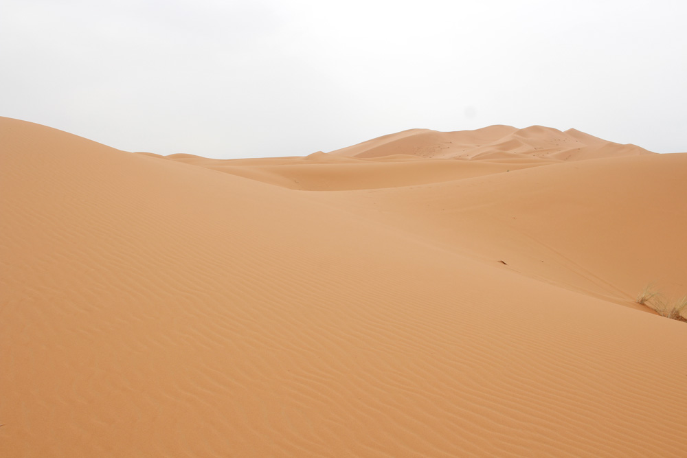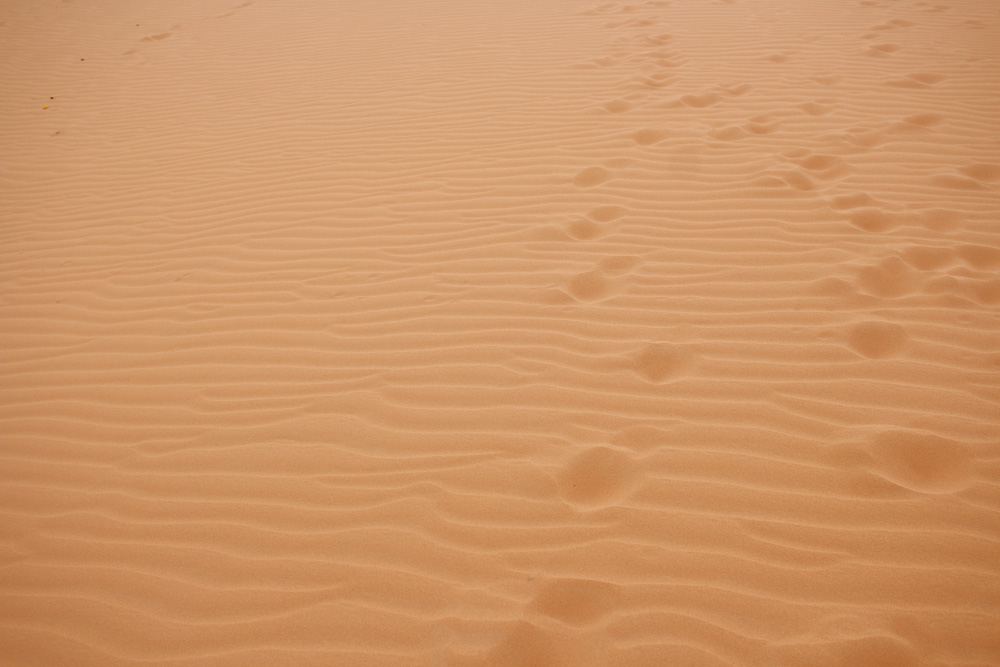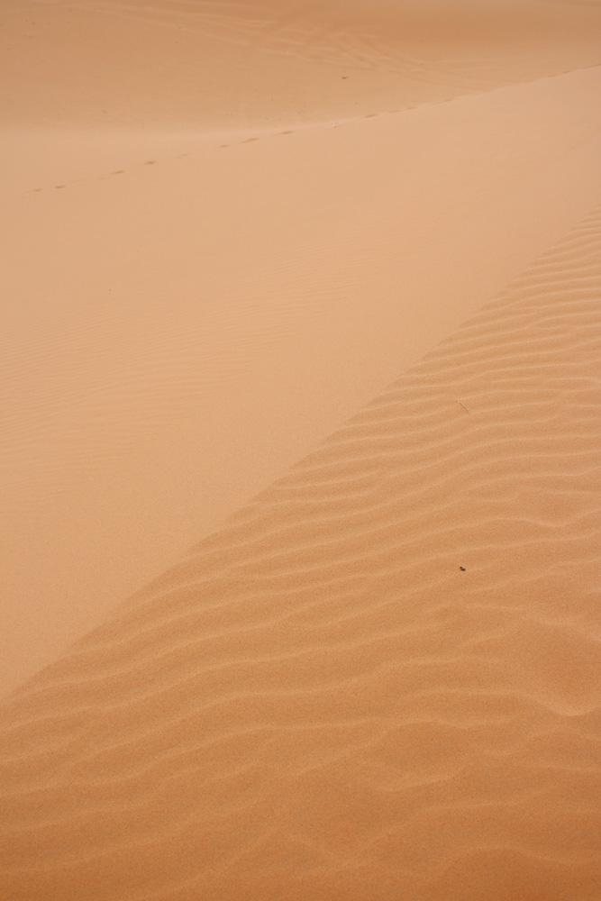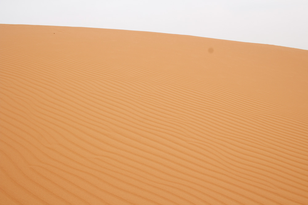 砂漠で見られる風の描く文様を風紋と言う。地面の角度、光の角度、強さ、風の強さや方向、地形、砂の質、地面の硬さ、湿度などさまざまな要素が影響して描かれる文様はさまざまだ。足跡や車の轍も時間が経つとまたどこかから砂が運ばれ、いつしか文様が姿を現す。砂の粒がとても細かく乾燥した気候だから見られる風景だ。砂山の頂上付近の傾斜の大きいところではある角度を境に砂が流されて崖のようになって文様のエッジができていたり、ある距離を境に風紋は視覚の同化現象によって目に見えなくなったり。稜線はなだらかな曲線を描き、さらに奥にいくつも連なっていく。自然の造形の多くは長い年月を経て生み出された結果だが、ここの風の描く即席のパターンと造形はとても自由に形を変え、インタラクティブなのが面白い。聞こえるのは風の音と自分の足音。時折しつこくまとわりつくハエの羽音と観光客を乗せたバギーの低いエンジン音。砂と風の作り出す立体的造形を眺めてゆっくりと半日を過ごした。